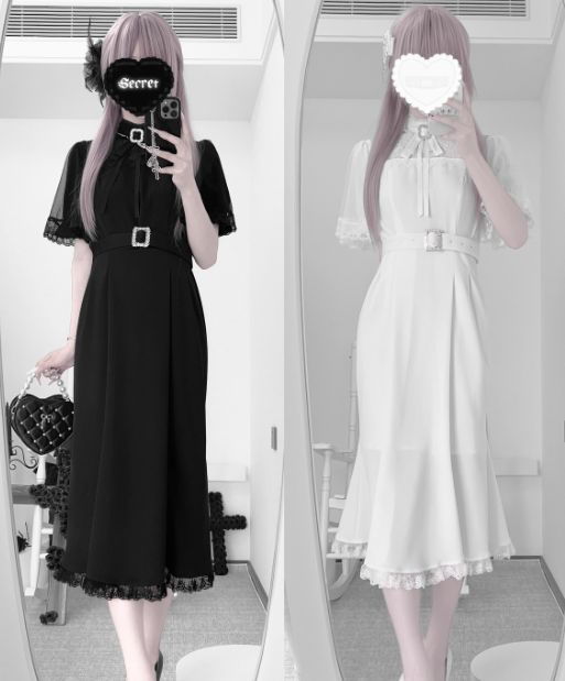 地雷系 量産型 ワンピース ロングワンピ レース ベルト付き ロリータ ゴシック ブラック ホワイト 長袖 Aライン フ ワンピ 原宿系 病みかわいい 韓国ファッション レディース 春 秋 冬 BLACKFEMALETHERAPIST_ORG