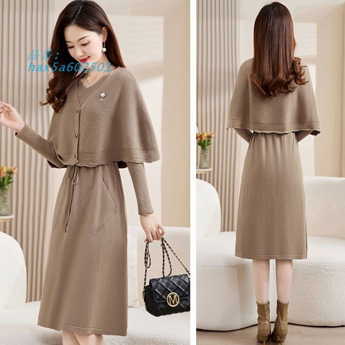 カーディガン風ケープ付き 膝丈長袖ニットワンピース 赤 カーキ 茶 カジュアル 服装 韓国 レディース デート hax5a602501の検索結果